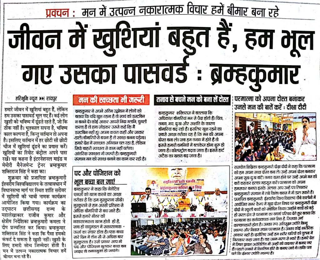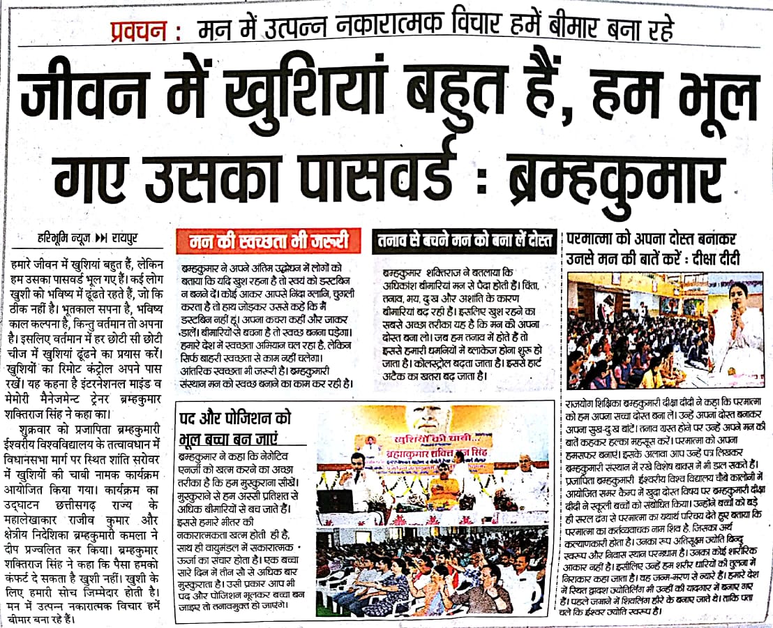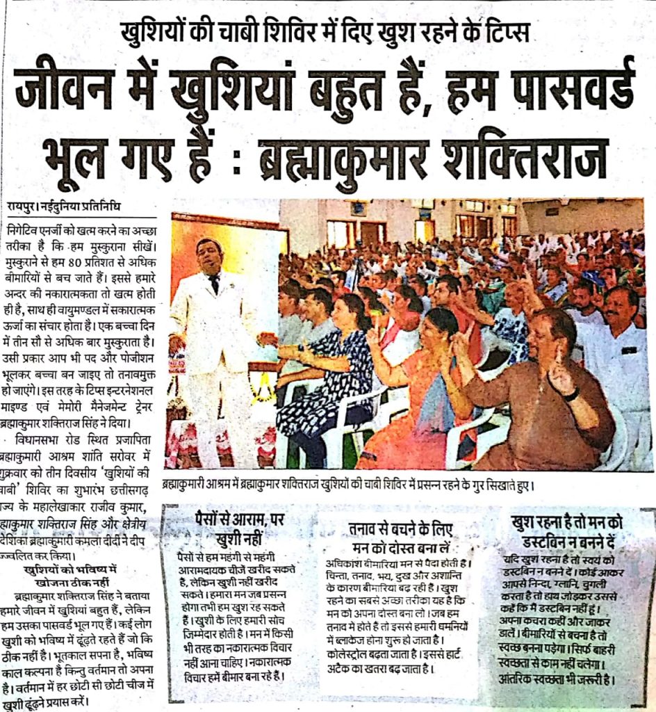 Raipur Press News :इन्टरनेशनल माइण्ड व मेमोरी मैनेजमेन्ट ट्रेनर ब्रह्माकुमार शक्तिराज सिंह